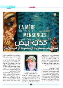 “كذب أبيض” هو “كذب بالألوااان”، وخديعة انطلت على العديد من المتتبعين السينمائيين، لكن المتمعن للعمل بعيدا عن أضواء الإعلام البهرج الزائف، ونقد باعة الخردة البراقة (نقاض الوضوء)، ينجلي له الكذب المعسول من حيث أحداث الشريط نفسه التي تفضح بنيته الهشة، إذ أتى معزولا عن معطيات الزمكان وسياقها التاريخي، وتغليف ذلك في تصوير علاقة خاصة بين الحفيدة والجدة، علاقة شبه متنافرة وجد متوترة مقرونة بتضخم الأنا العليا لديهما، تخادعنا فيها عن صلب الطرح: صور “أحداث انتفاضة الكوميرا”.
